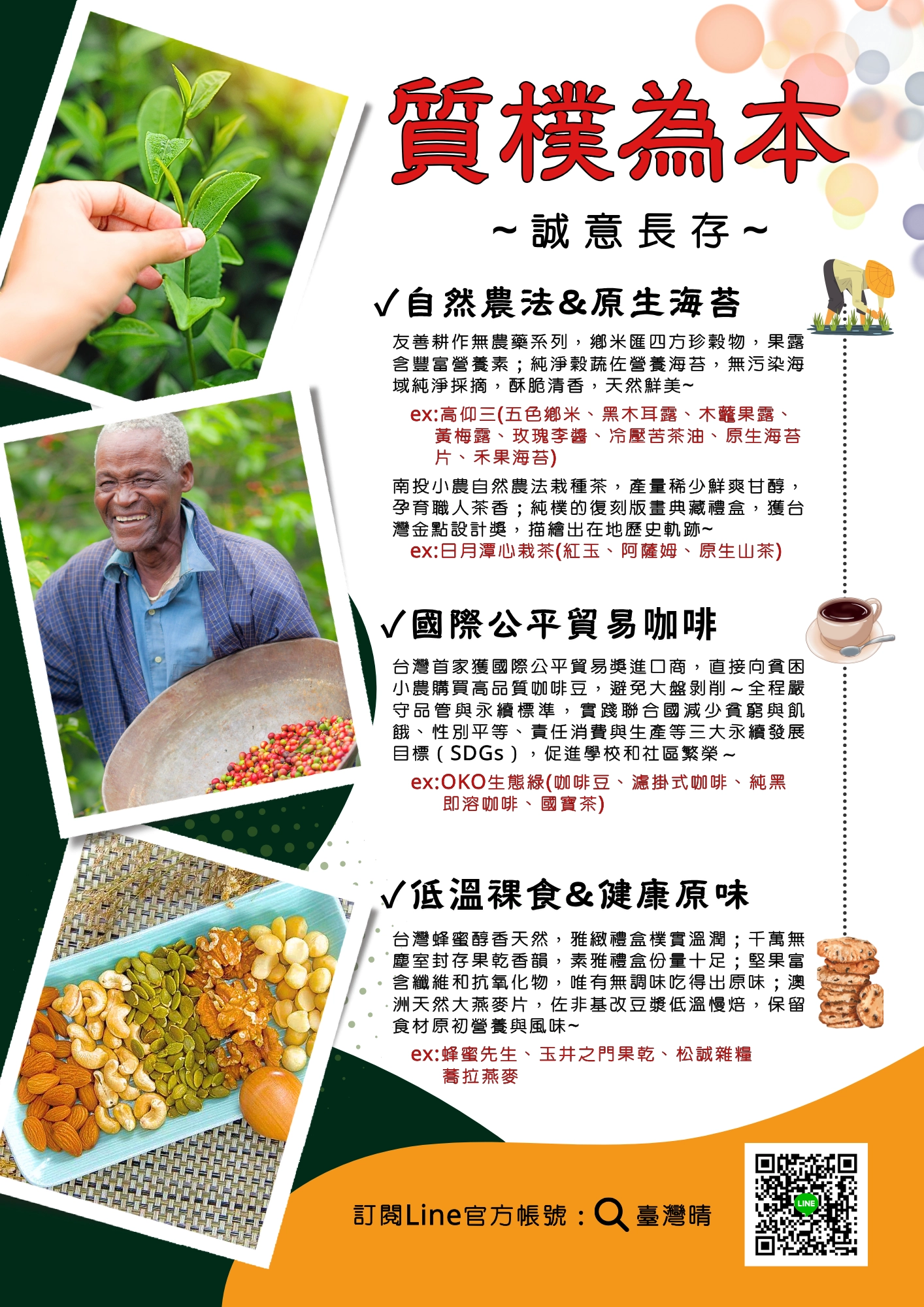 創辦人從業務員到主管,除了時刻精進專業,歷經十餘年商務淬鍊,深感有效維繫客戶情誼與職場凝聚力乃成功之道~返鄉後創立伴手禮服務,堅持挑選有機, 無添加, 公平貿易農產品,匯集小農與大地恩賜,搭配樸實禮盒來承載您欲表達的恩情厚意,溫暖每一刻!