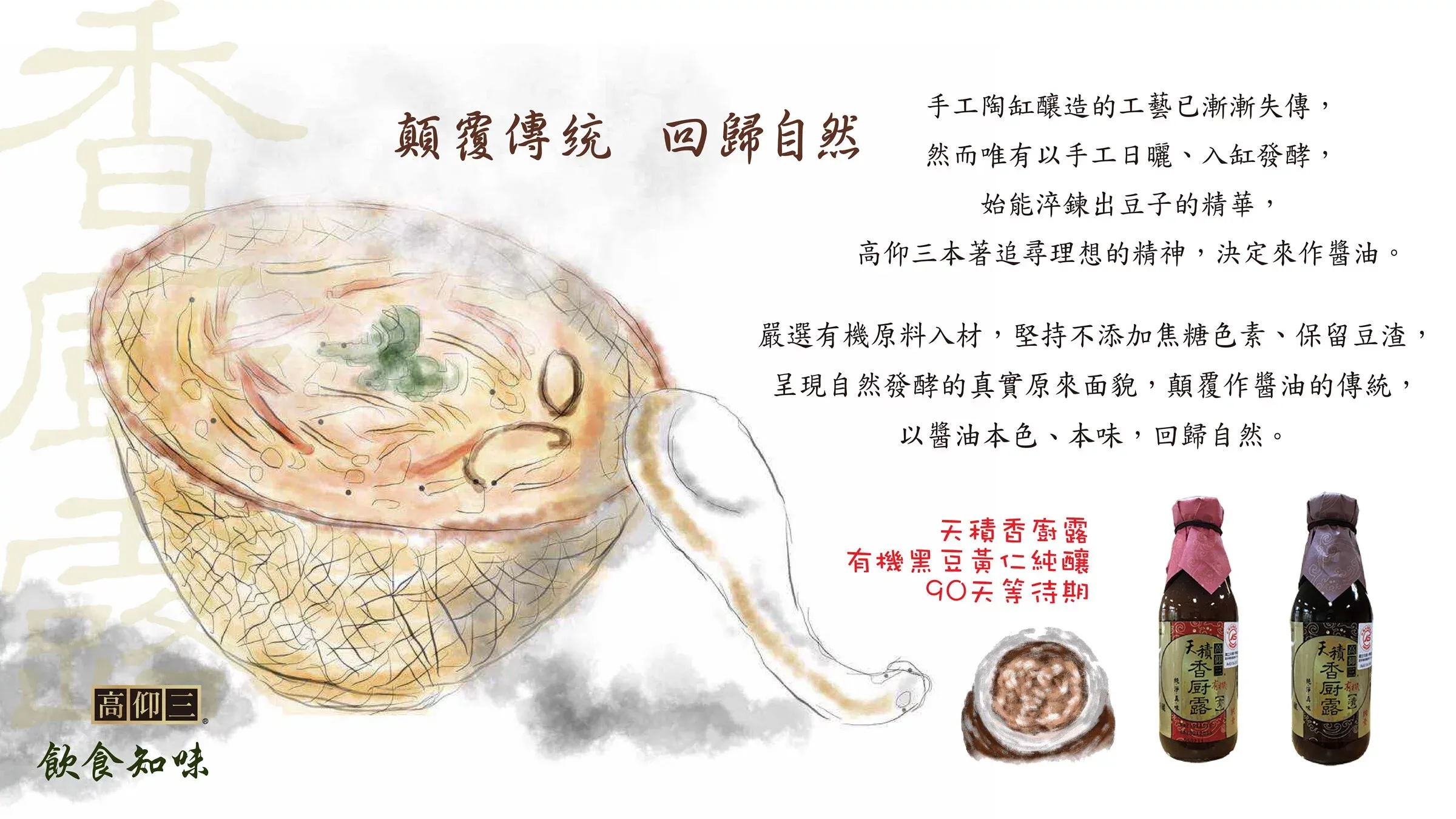 市面很多是小麥醬油或豆麥醬油來減低釀造成本,或使用人工甘味劑增添味道,也有使用葷食方法催化醬油的風味,形成一股「陳年」的味道,卻沒有了古早醬油的芬芳豆香。高仰三醬油是真正經過陶缸發酵,純釀製作,醃製豆類的鹽也是岩鹽的品質,釀造出來的醬油是豆子發酵的香氣,老一輩的人說是小時候的味道,故我們把這傳統醬油的風味喻為天積香廚。